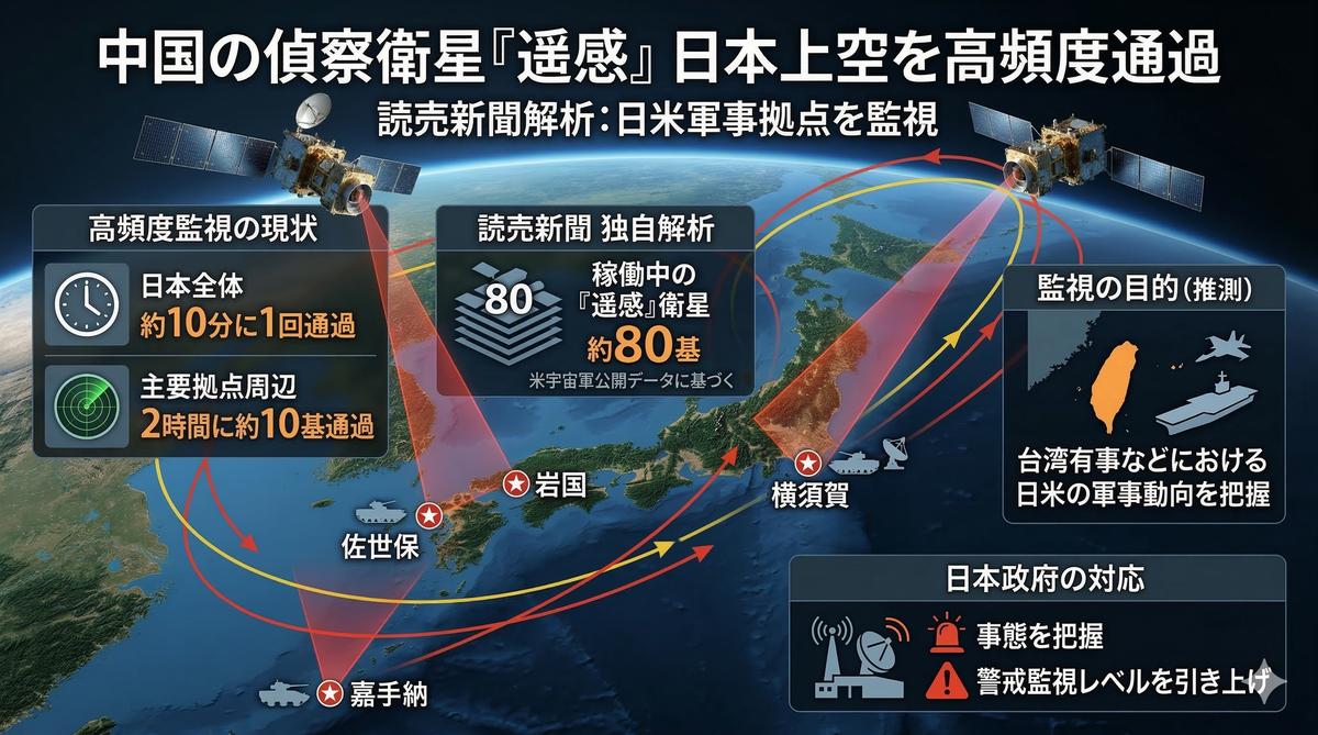 中国軍の偵察用衛星群、日本上空を10分に1回通過