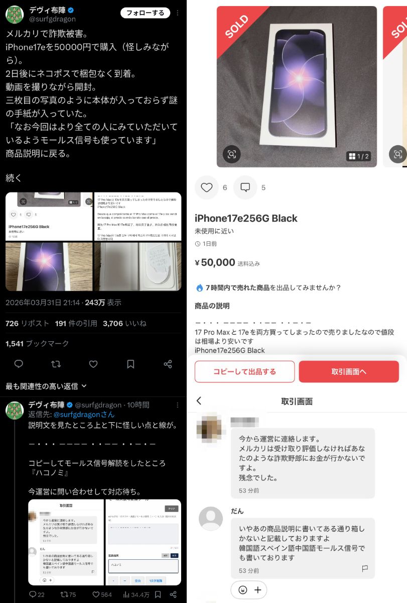 【速報】メルカリの治安終わる 自称在日中国人が「商品説明にモールス信号でハコノミと記載、iPhoneの箱だけを